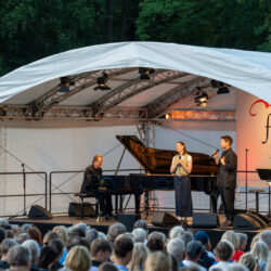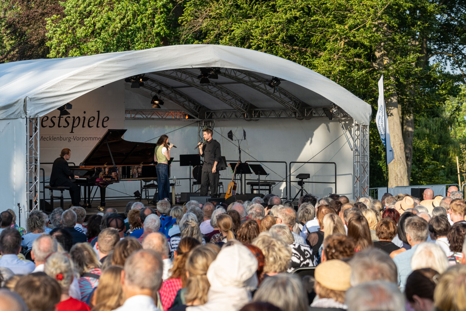 Am Wochenende ist der historische Park des Schlosses Fleesensee einmal mehr zur Kulisse eines außergewöhnlichen musikalischen Abends geworden. Im Rahmen der Festspiele Mecklenburg-Vorpommern erlebten rund 2.000 Gäste ein Open-Air-Konzert der besonderen Art – ein inspirierendes Zusammenspiel von Klassik, Pop, Jazz und Singer-Songwriter-Klängen. Im Zentrum des Abends stand die Begegnung zweier herausragender Künstlerpersönlichkeiten: Der international gefeierte Pianist Sebastian Knauer und Johannes Strate, Frontmann der Band Revolverheld. Mit viel Charme und Charisma führten sie durch das Programm, kamen ins Gespräch mit dem Publikum und überzeugten mit musikalischer Vielseitigkeit. Unterstützt wurden sie von Jazzpianist Martin Tingvall, der unter anderem zwei Songs aus dem neuen Album der The Voice of Germany-Gewinnerin Malou Lovis einfühlsam begleitete.