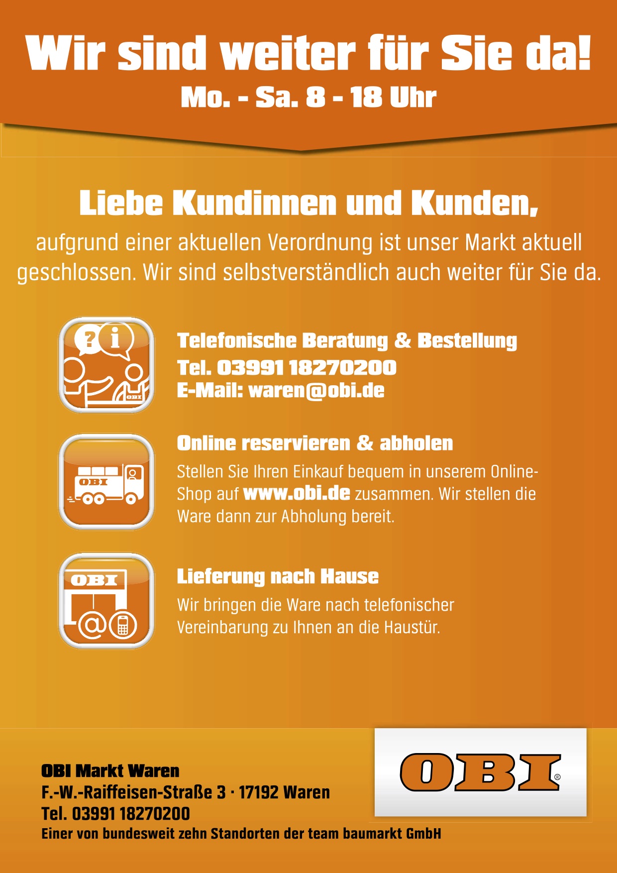 Telefonische Bestellungen sind unter 03991 627235 oder per Mail unter service311@obi.de möglich. Den Einkauf bequem zusammenstellen kann man auf der Homepage www.obi.de.