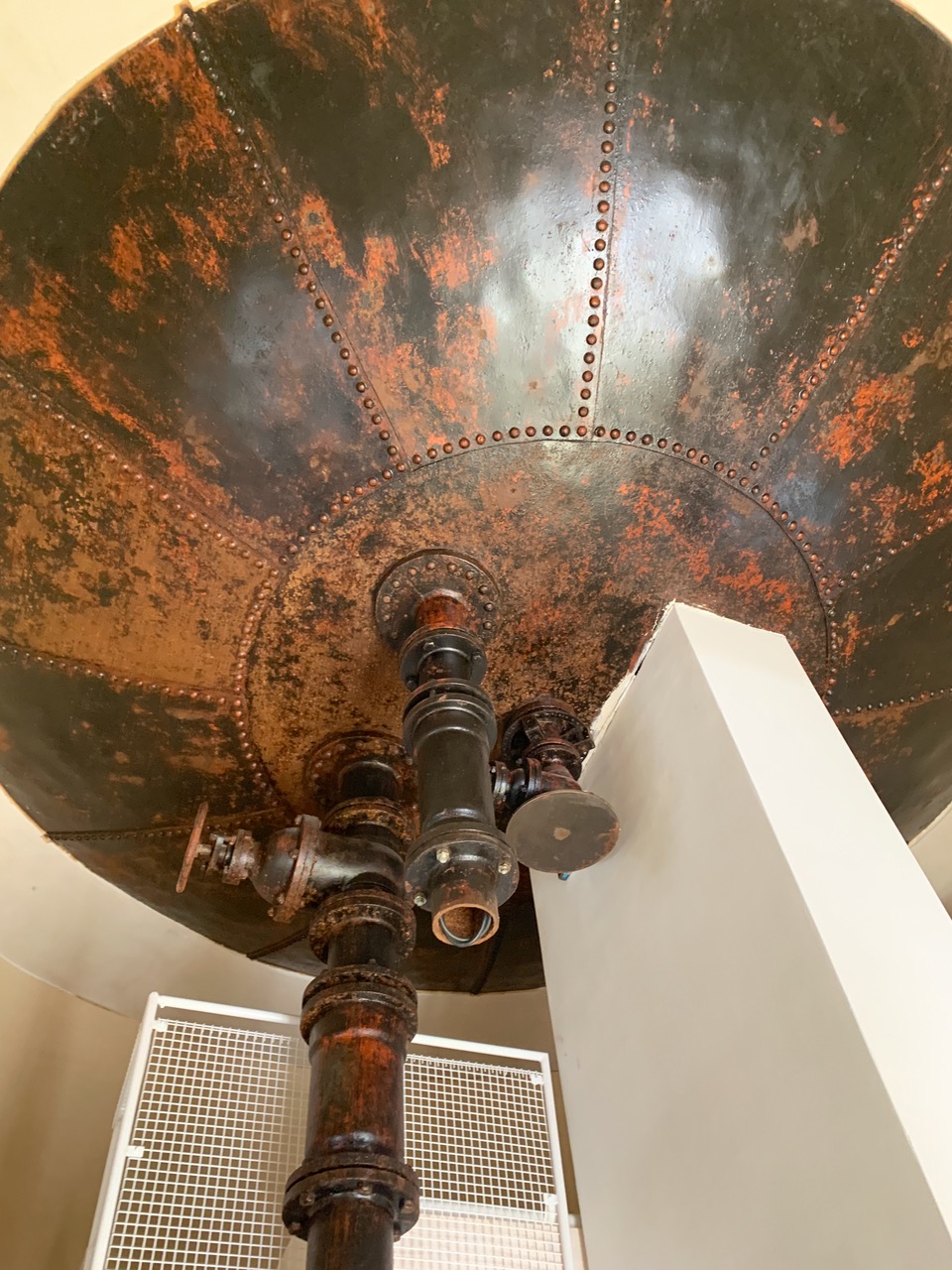 Im Turm erinnern viele kleine Details an den eigentlichen Zweck, für den er gebaut wurde – nämlich die Wasserversorgung Warens. Da gibt es Teile des großen Kessels, die heute als kunstvolle Lampe dienen, da blickt man vom Bett aus auf den alten Kesselboden und da dient ein dickes altes Wasserrohr heute als Halter für Küchenzubehör.