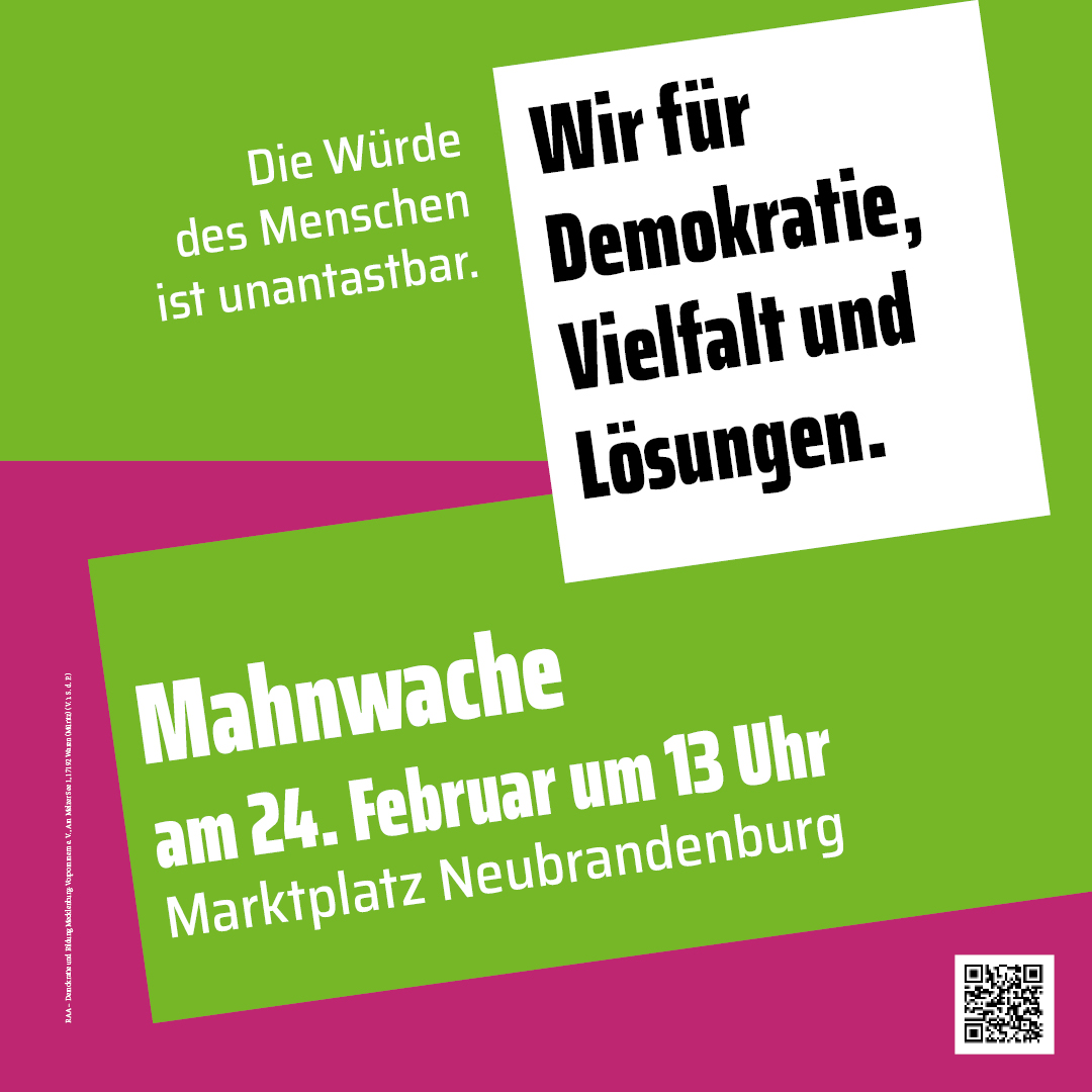 Das Bündnis für Demokratie und Zusammenhalt in Neubrandenburg lädt am morgigen Sonnabend, 24. Februar, ab 13 Uhr erneut zu einer Mahnwache auf den Neubrandenburger Marktplatz ein. Es werden Redner auf die derzeit gesellschaftlich angespannte Situation und die in großen Teilen der Gesellschaft wahrgenommene Gefährdungslage für die Demokratie eingehen. Zu den Rednern zählt neben Noah Alexander Wolf und Sven Müller von der Theater und Orchester GmbH auch der Pianist Igor Levit. Levit wird zuvor – um 11 Uhr beginnend – ein Benefizkonzert in der Neubrandenburger Konzertkirche geben. Umrahmt werden die Reden von musikalischen Beiträgen durch Marcel Beuter.
