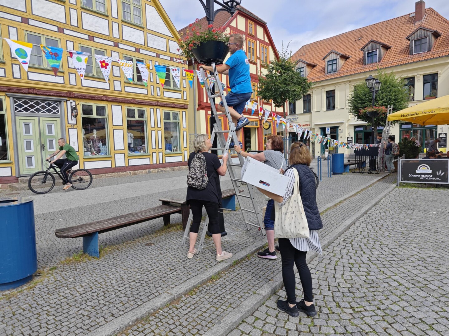 So, kann losgehen – Waren ist geschmückt. Zumindest die vielen hundert Wimpel hängen in der Kietzstraße, Strandstraße, in der Friedensstraße, in der Langen Straße und auf dem Neuen Markt. Wochenlang hatten viele Freiwillige die Wimpel genäht und gestaltet, heute Vormittag ging es ans Aufhängen. Dabei hatte der Innenstadtverein als neuer Veranstalter des Warener Müritzfestes Hilfe von einigen Näherinnen. Doch dem Aufruf des Vereins, mitzuhelfen, ist sonst leider niemand gefolgt. Gut vier Stunden haben die Freiwilligen heute gebraucht, um die Wimpel aufzuhängen. Jetzt geht’s an die letzten Vorbereitungen, damit das 70. Müritzfest am Freitag starten kann. Hier noch einmal das komplette Programm: