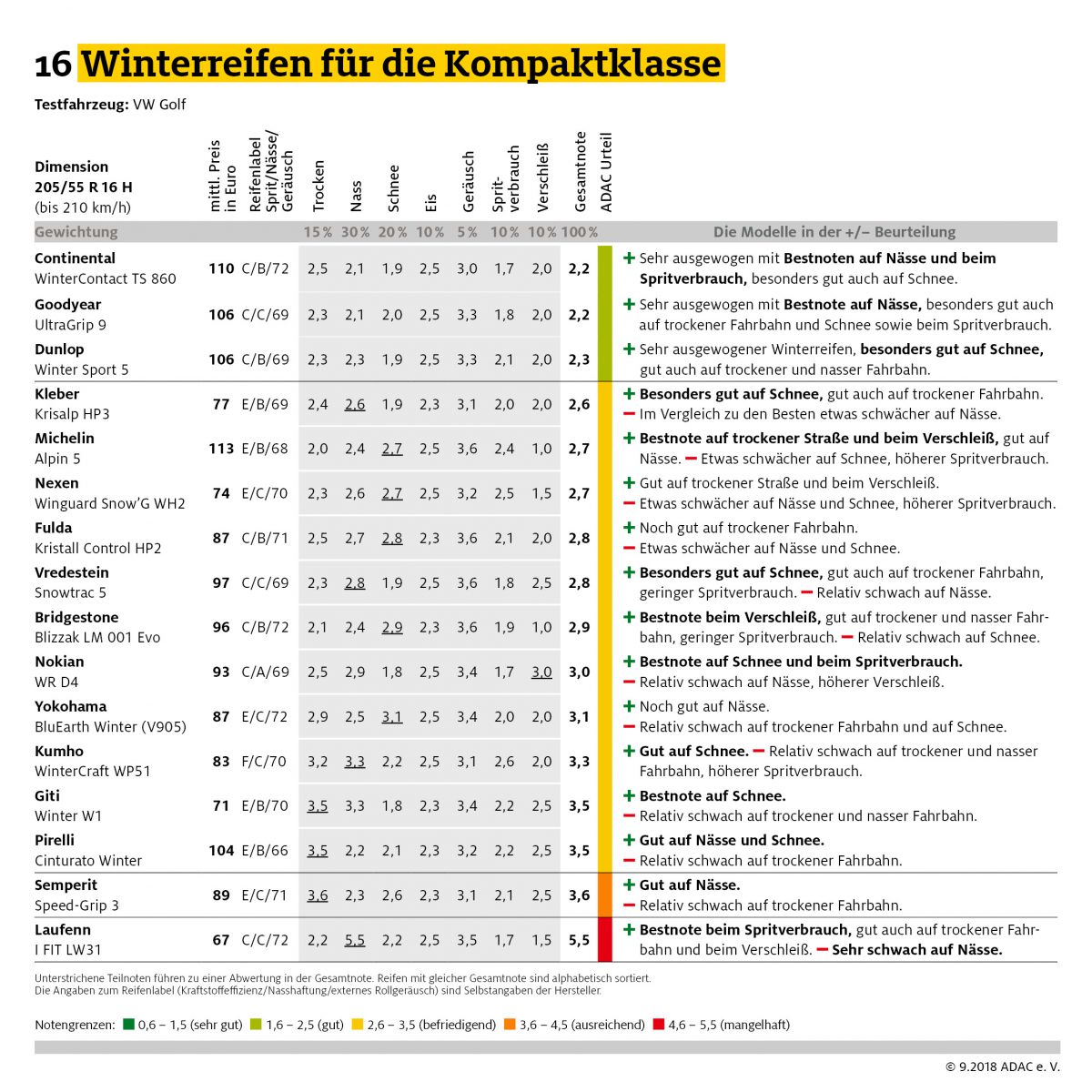 Ein Winterreifen soll auf Schnee, Eis und Nässe sicheren Grip haben und gleichzeitig möglichst wenig Sprit verbrauchen. Das ist der klassische Zielkonflikt, den ein Reifen im ADAC Winterreifentest bewältigen muss – neben etlichen anderen Herausforderungen wie Aquaplaning, Fahrstabilität und Haltbarkeit. Im aktuellen Test haben das in der Kleinwagendimension (175/65 R14) Continental und Dunlop „gut“ geschafft, in der Kompaktklasse (205/55 R 16) neben Continental und Dunlop auch noch Goodyear.