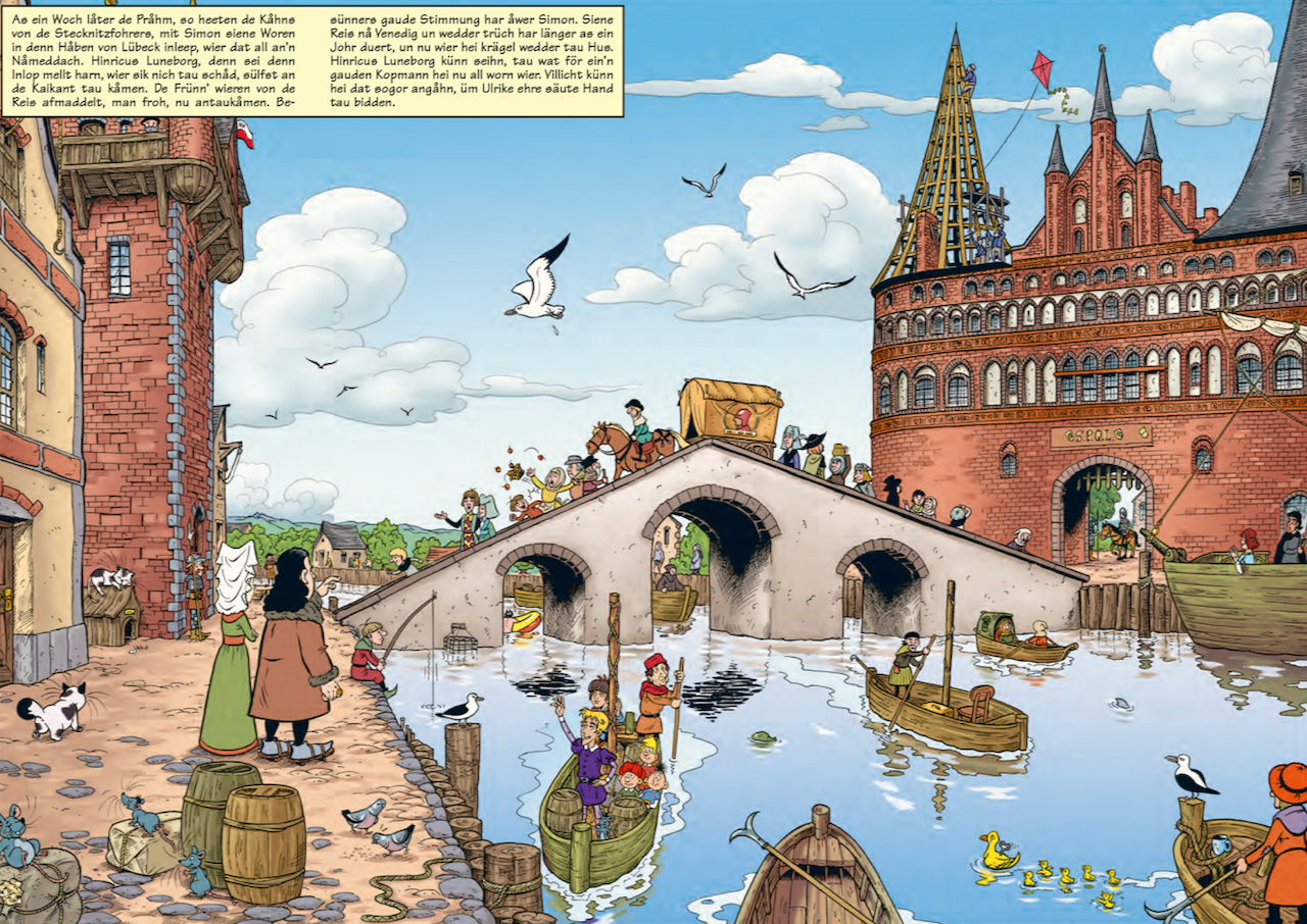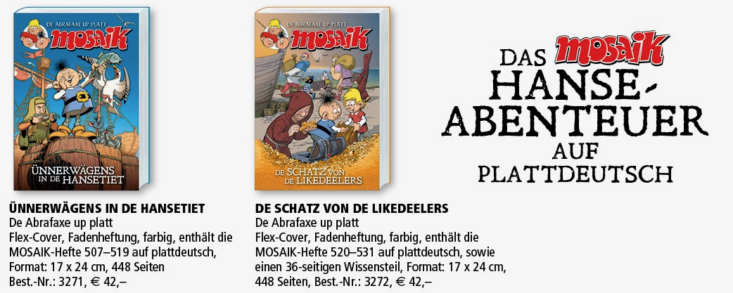 Kennen Sie das MOSAIK? Seit 1955 erscheint monatlich ein neues Heft, und die unglaublichen Abenteuer der Abrafaxe sind mit einer gedruckten Auflage von 100.000 Heften das meistverkaufte deutsche Comic-Magazin. Jetzt sind zwei dicke Bücher mit Abenteuern der Abrafaxe in der Hanse-Zeit auf Plattdeutsch erschienen. „Das hat uns einen Riesenspaß gemacht, wir haben uns stellenweise bei der Arbeit daran einzelne Sprechblasen vorgelesen und uns köstlich amüsiert, weil es superniedlich klingt“, berichtet Maren Ahrens. Sie ist Redaktionsleiterin bei der MOSAIK Steinchen für Steinchen Verlag GmbH und eine Warenerin.