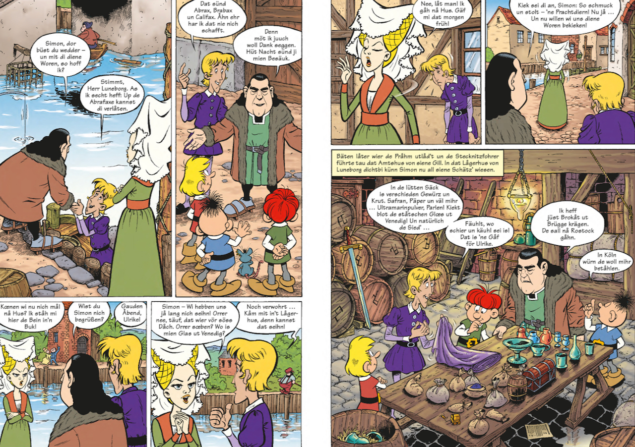 Das Hanse-Abenteuer der Abrafaxe gibt es nun in einer zweibändigen niederdeutschen Ausgabe. Die Übersetzung stammt von der Schwerinerin Susanne Bliemel – ausgezeichnet mit dem Fritz-Reuter-Preis 2020. Das Lektorat übernahm Ulrike Stern (Kompetenzzentrum für Niederdeutschdidaktik an der Universität Greifswald).