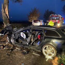 Die Verfolgung wurde dann abgebrochen. Die Beamten fuhren weiter in Richtung der Ortschaft Biesen, wo sie das völlig zerstörte Wrack vorfanden. Der Wagen war mit sehr hoher Geschwindigkeit gegen einen Baum geprallt. Eine Person wurde durch den Aufprall aus dem Fahrzeug geschleudert, eine weitere Person wurde in dem Audi eingeklemmt.