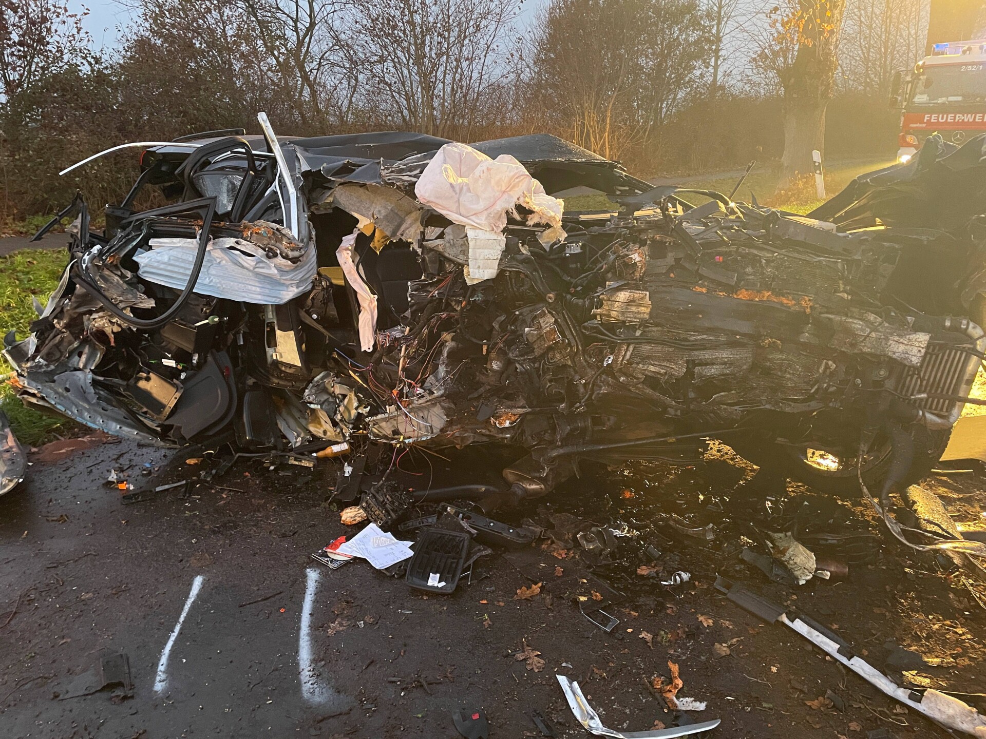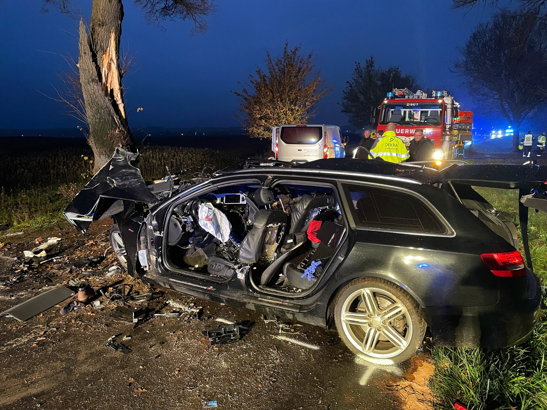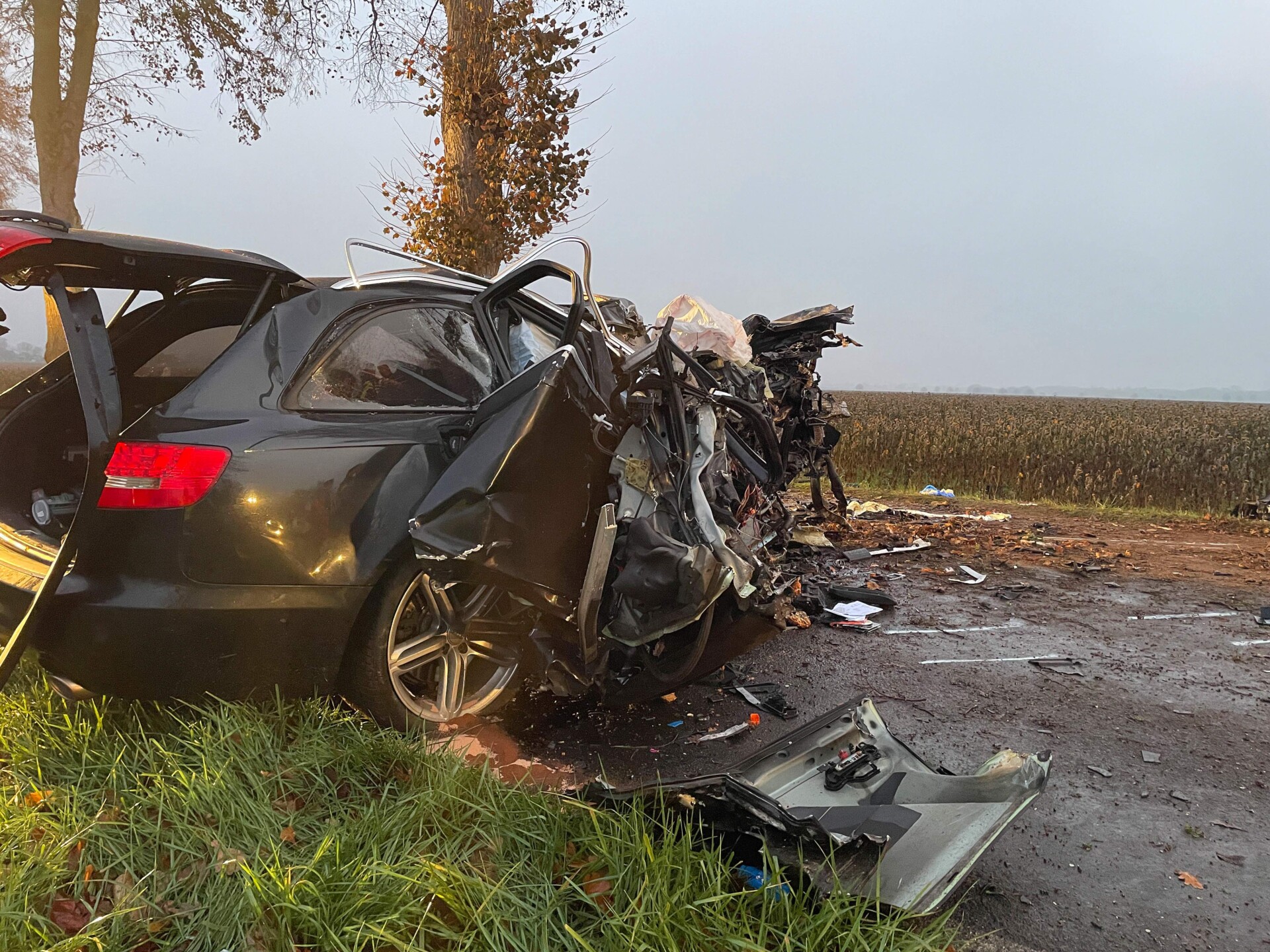 Die Verfolgung wurde dann abgebrochen. Die Beamten fuhren weiter in Richtung der Ortschaft Biesen, wo sie das völlig zerstörte Wrack vorfanden. Der Wagen war mit sehr hoher Geschwindigkeit gegen einen Baum geprallt. Eine Person wurde durch den Aufprall aus dem Fahrzeug geschleudert, eine weitere Person wurde in dem Audi eingeklemmt.