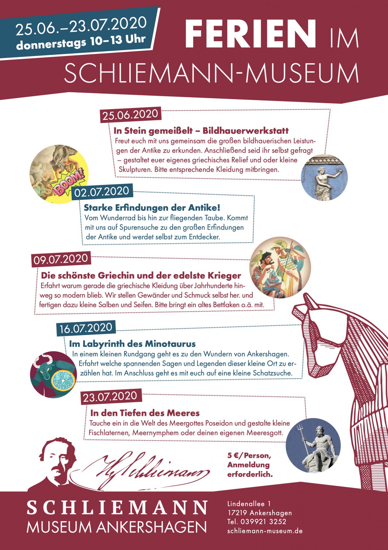 Das Heinrich-Schliemann-Museum Ankershagen hat vom 25. Juni bis 23. Juli jeden Donnerstag von 10-13 Uhr ein tolles Ferienangebot für Schulkinder organisiert. Interessante Themen warten auf all jene, die gerne vorbei schauen und sich kreativ mit der Antike beschäftigen möchten – von der Bildhauerwerkstatt bis hin zu den starken Erfindungen der Antike. Die Veranstaltungen sind teilnehmerbeschränkt, das heißt, eine vorherige Anmeldung ist nötig. Die Veranstaltungen finden unter freiem Himmel im Museumsgarten statt.