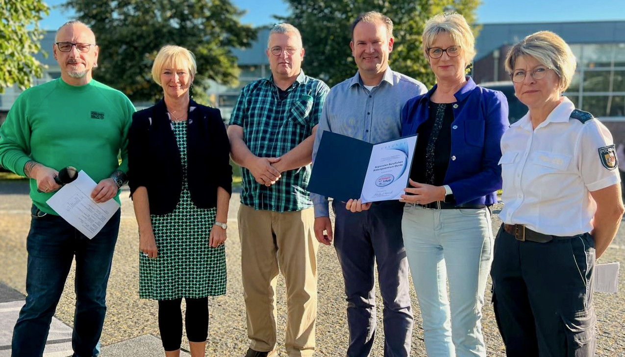 Der Chef des Kreis-Ordnungsamtes, Peter Handsche, nutzte die Gelegenheit, und verlieh dem RBB das Qualitätssiegel „Sicherheit macht Schule“ – und das nun schon zum zehnten Mal. „Schulen mit diesem Qualitätssiegel zeigen, dass sie über ihre in Gesetzen und Verordnungen geregelten Pflichtaufgaben hinaus eine breite Palette an unfall-gesundheits-und gewaltpräventiven Maßnahmen anbieten und damit der objektiven und subjektiven Sicherheit ihrer Schüler sowie ihrer Lehrer einen besonderen Stellenwert im Schulalltag beimessen. Das Qualitätssiegel trägt auch dazu bei, das Schulklima zu verbessern, Arbeitszufriedenheit und Lernerfolge zu befördern sowie den Ruf und die Außenwirkung der Schule zu unterstützen“, so Handsche.