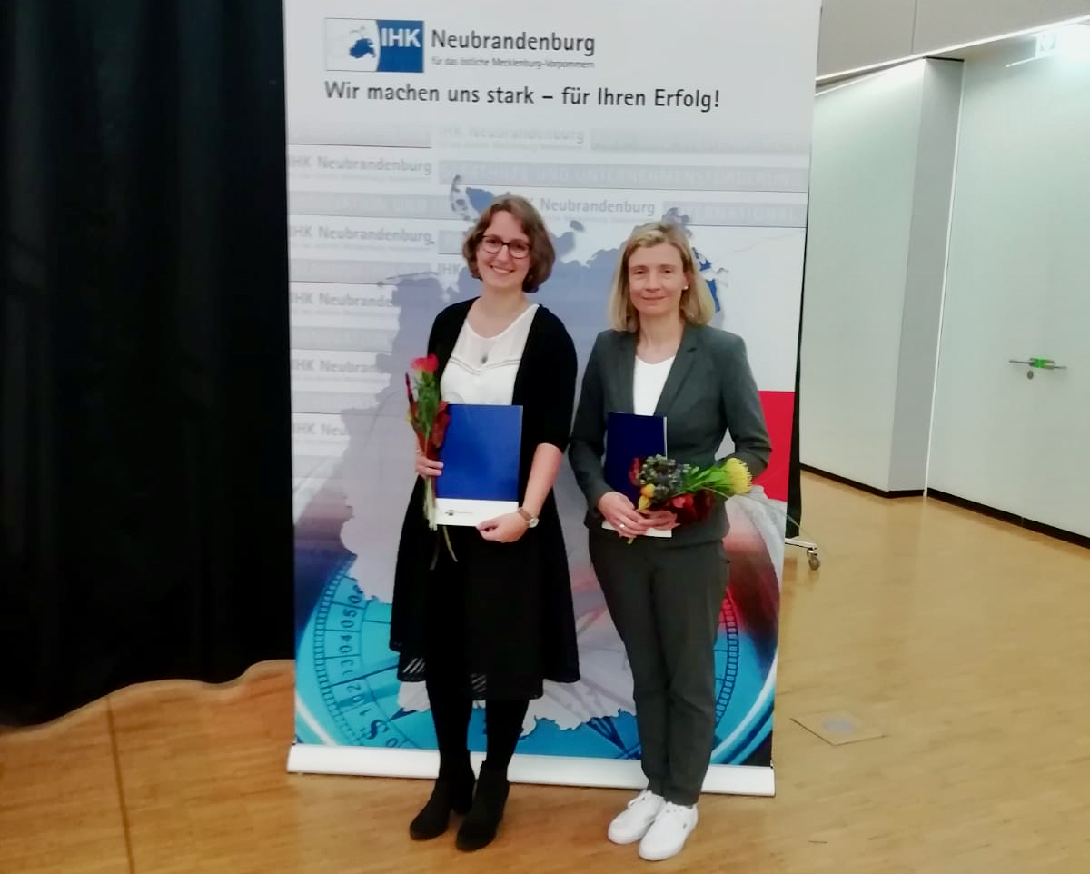 Große Freude bei der Wohnungsbaugesellschaft Waren mbH (Wogewa): Heute ist die ehemalige Auszubildende des Unternehmens, Anne Moritz, als Beste ihres Ausbildungsjahrgangs der Immobilienkaufleute der IHK Neubrandenburg ausgezeichnet worden. Diesen besonderen Termin hat sich auch Wogewa-Geschäftsführerin Kristin Görlach nicht entgehen lassen. Schließlich war sie auch die Ausbilderin von Anne. „Die Ausbildung hat mir super gefallen“, resümiert Anne Moritz, die mittlerweile im Unternehmen die Stelle der Wohneigentumsverwalterin übernommen hat.