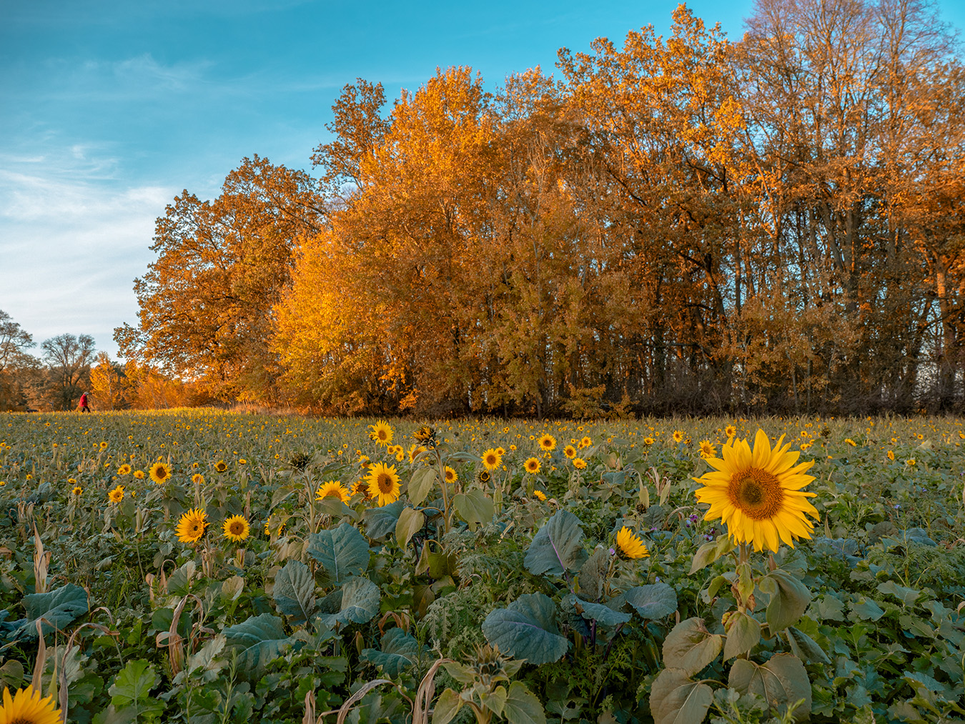 Sonnenblumen vor dem herbstlichen Blätterwald, aufgenommen im Müritz-Nationalpark von Carsten Bremer.