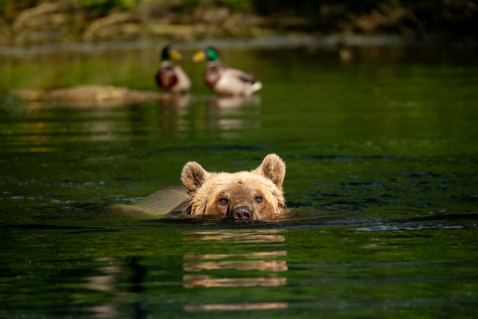 Bild oben: Bärin Luna mit Wildenten, die ebenfalls im Bärenwald Müritz Zuhause sind.