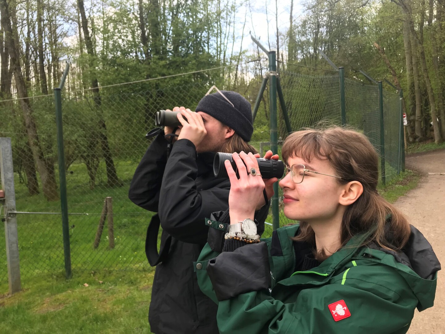 Bild unten: Die Studenten Nils Beyer und Finja Scholl (von links) haben das Bärenwald-Aktionswochenende mit viel Herzblut vorbereitet. Besucherinnen und Besucher können sich an der NaBu-„Stunde der Gartenvögel“ beteiligen. Wer möchte, kann gerne sein eigenes Fernglas mitbringen