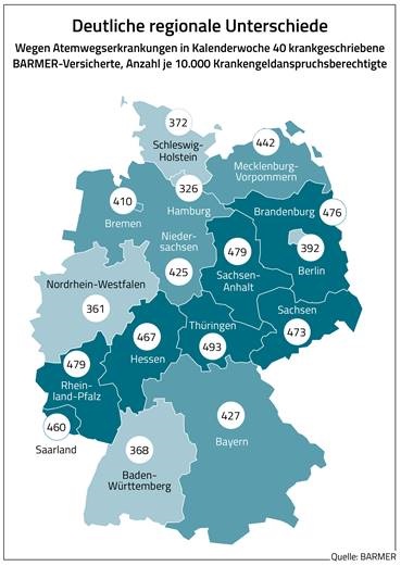 Den Ergebnissen der Analyse zufolge gibt es massive regionale Unterschiede bei der Rate der Atemwegs-Krankschreibungen. In KW 40 war Thüringen mit 493 je 10.000 Krankengeld-Anspruchsberechtigten am stärksten betroffen. Auf Platz zwei und drei befanden sich Rheinland-Pfalz und Sachsen-Anhalt mit jeweils 479 je 10.000 Krankengeld-Anspruchsberechtige, die wegen Atemwegserkrankungen arbeitsunfähig waren. Den niedrigsten Wert gab es in Hamburg mit 326 je 10.000 Anspruchsberechtigte.