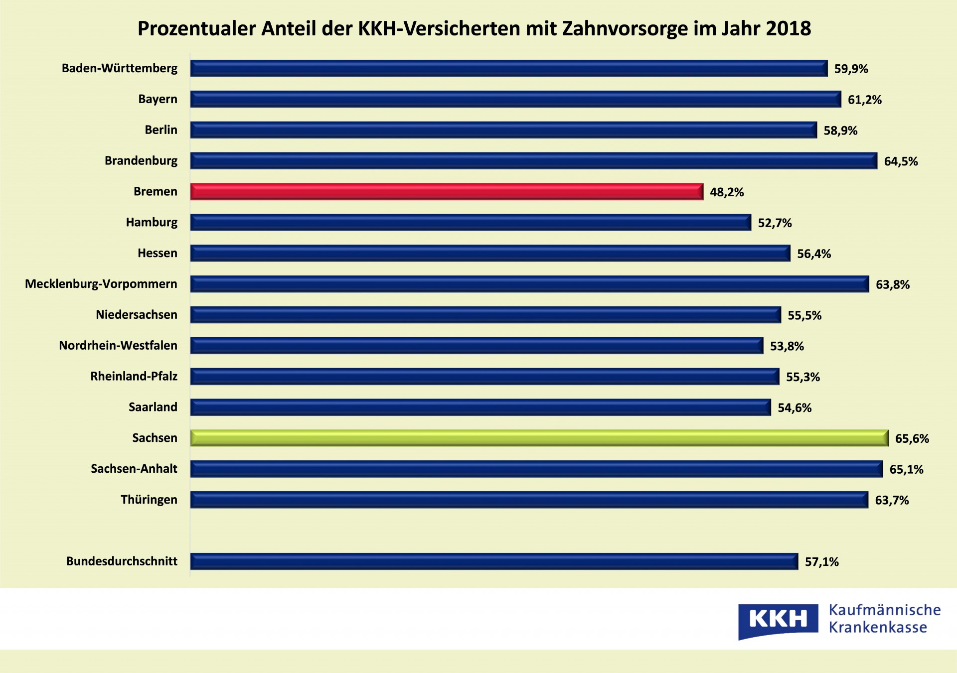 Der Bundesländervergleich zeigt darüber hinaus, dass die Frauen in allen Regionen Deutschlands gewissenhafter mit ihrer Zahngesundheit umgehen als die Männer – vor allem im Osten der Republik. Auf Platz eins liegen Sachsens Frauen mit 70,7 Prozent, gefolgt von Sachsen-Anhalts, Thüringens, Brandenburgs und Mecklenburg-Vorpommerns Frauen. Schlusslicht sind Bremens Männer mit einer Vorsorgequote von nur 41 Prozent. Im Bundesdurchschnitt gehen 62,3 Prozent der Frauen und 50,5 Prozent der Männer mindestens einmal jährlich zur Zahnkontrolle.