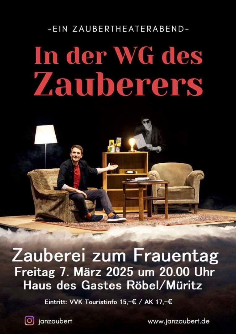 Frauen sind doch zauberhaft, oder? Wie auch immer, im Haus des Gastes Röbel gibt es zum Frauentag bereits am kommenden Freitag, 7. März, einen zauberhaften Abend unter dem Motto „In der WG des Zauberers“. Jan Speiser will die Besucher ab 20 Uhr– auch Männer sind herzlich willkommen – verzaubern. Die Gäste erwartet ein humorvoller „Zaubertheaterabend“. „Es soll Menschen geben, die empfinden es als ein Grauen, in einer WG zu leben. Ich finde es großartig. Und es bietet Potential für so manch kuriose Geschichte. Es soll Menschen geben, die empfinden Naturwissenschaften als langweilig. Ich finde sie großartig. Und sie bietet Potential für so manch ein ungläubiges Staunen. Es soll Menschen geben, die empfinden Zauberkunst als verarscht werden. Ich finde sie großartig. Und sie bietet Potential für so manch eine Überraschung“, so beschreibt der Künstler kurz umrissen sein Programm.