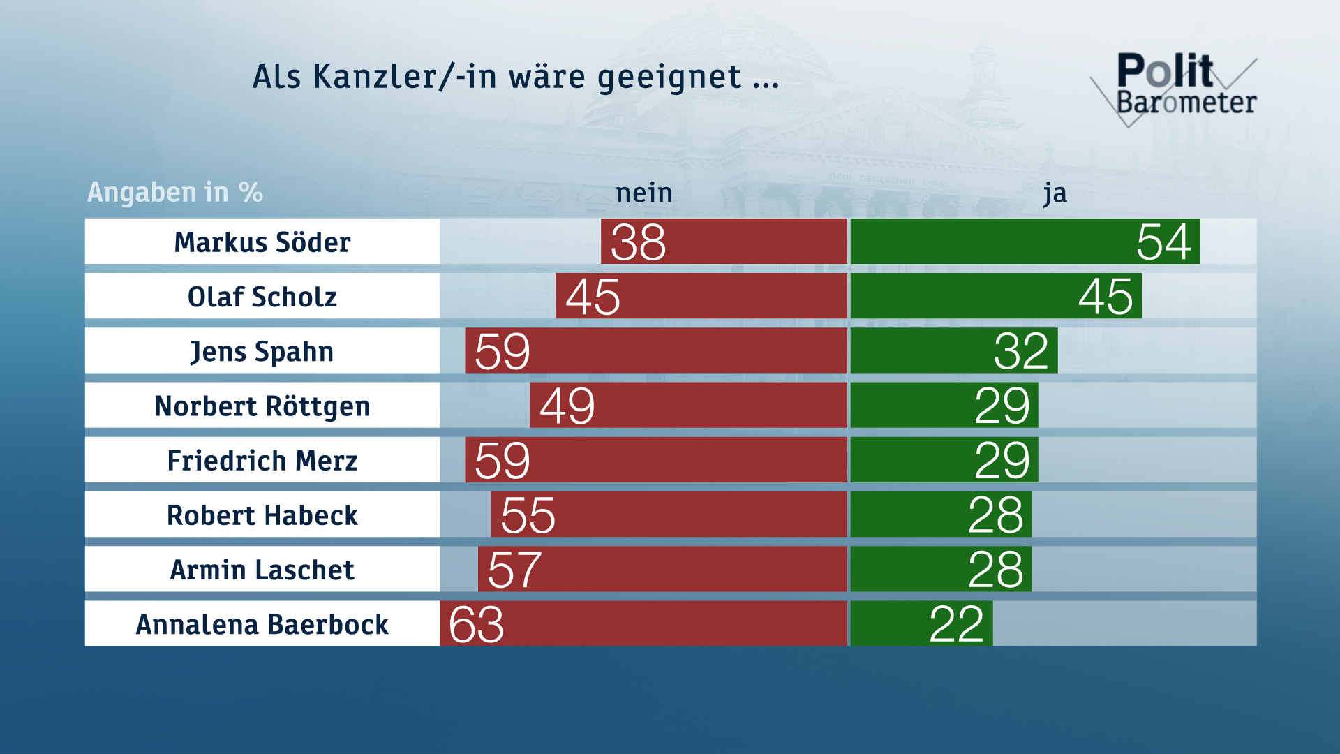 Auf die direkte Frage, ob man jemanden für geeignet als Bundeskanzler/-in hält, wird das mehrheitlich lediglich Markus Söder zugetraut (ja:54 Prozent; nein:38 Prozent). Bei Olaf Scholz sind die Meinungen geteilt (ja: 45 Prozent; nein: 45 Prozent), und bei allen anderen sehen jeweils weniger als ein Drittel aller Befragten eine Kanzlereignung: Jens Spahn (32 Prozent), Norbert Röttgen (29 Prozent), Friedrich Merz (29 Prozent), Robert Habeck (28 Prozent), Armin Laschet (28 Prozent), Annalena Baerbock (22 Prozent). Selbst die Anhänger der CDU/CSU sprechen Merz, Laschet und Röttgen mehrheitlich die Kanzlerfähigkeit ab. Das sieht bei Scholz, Habeck und Baerbock in deren Partei-Anhängergruppen ganz anders aus. Deren Parteianhänger halten sie mehrheitlich jeweils für das Kanzleramt geeignet.