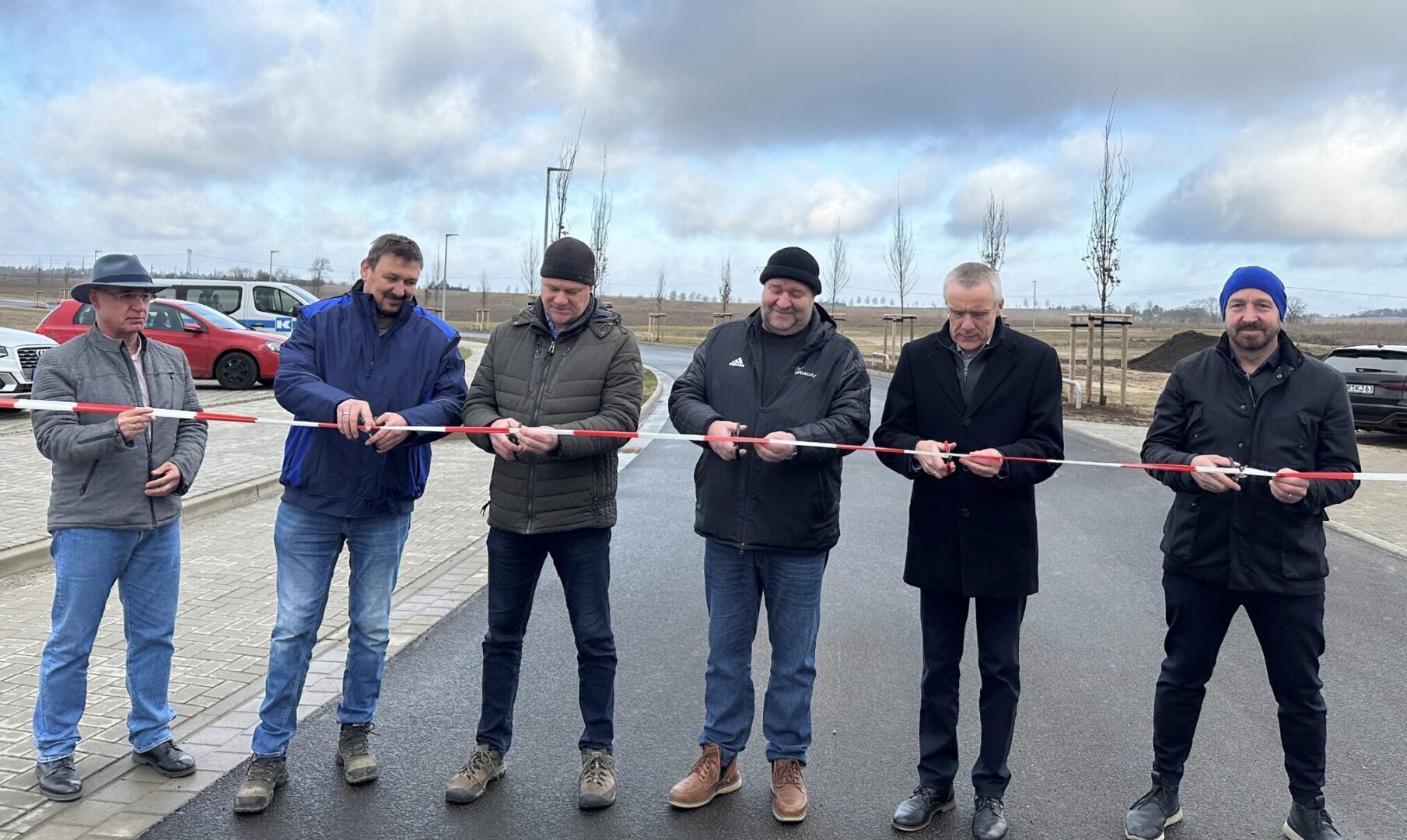 Bild: Bei der Einweihung der verlängerten Straße: Mike Stange (Stadt Waren (Müritz), Torsten Schwinkendorf (Stadtwerke),Thomas Grassow (IGN), André Göring (Immig Bau), Bürgermeister Norbert Möller und Warens Bauamtsleiter Thomas Mura (von links).