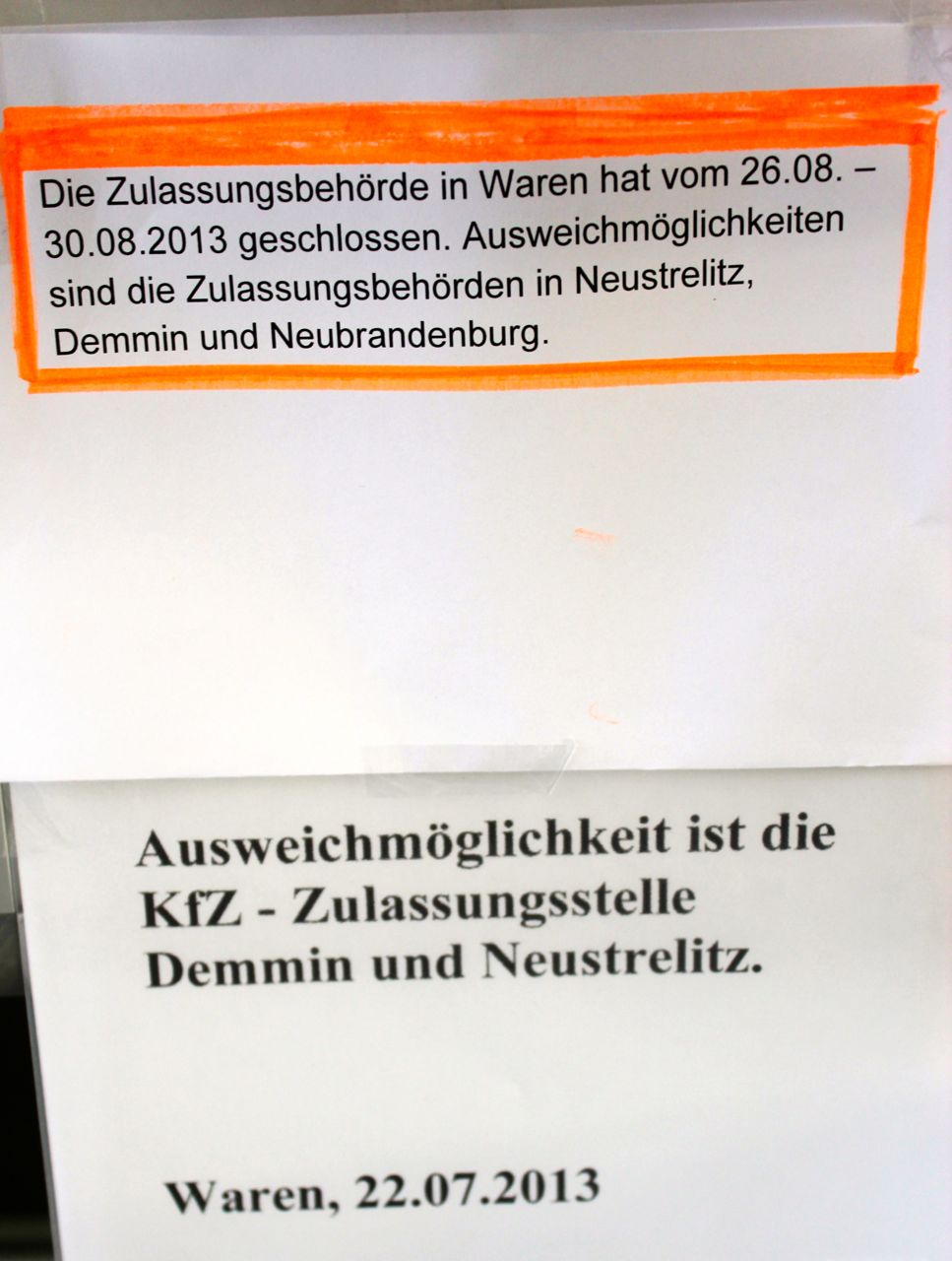 So wollte heute früh eine Frau aus Wendorf ein Kurzzeit-Kennzeichen besorgen, um dann gleich weiter mit dem Zug nach Berlin zu fahren und dort ein Auto abzuholen. Zuvor hat sie zwar auf die Homepage des Landkreises geschaut, dort aber nur auf die Öffnungszeiten der Zulassungsstelle, nicht aber auf die Bekanntmachungen. Um so größer ihre Verzweiflung, als sie vor Ort am Amtsbrink feststellen musste, dass sie ihr Kurzzeitkennzeichen in Waren nicht bekommt und damit ihr Vorhaben, das Auto aus Berlin zu holen, wohl knicken konnte.