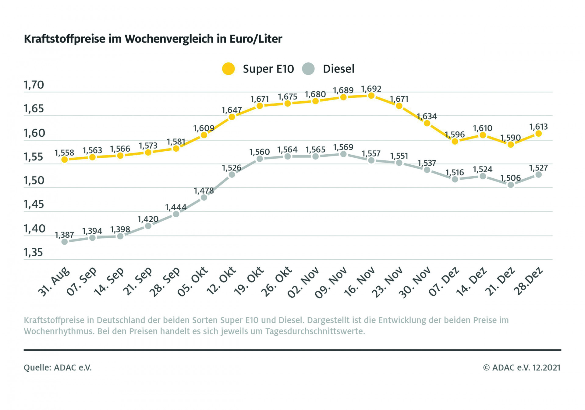 Zum Ende des Jahres müssen Autofahrer beim Tanken noch einmal tiefer in die Tasche greifen. Laut aktueller ADAC Auswertung der Kraftstoffpreise kletterte der Preis für einen Liter Super E10 im Vergleich zur Vorwoche um 2,3 Cent und liegt derzeit im bundesweiten Mittel bei 1,613 Euro. Diesel kostet im Schnitt 1,527 Euro, das ist ein Anstieg von 2,1 Cent.