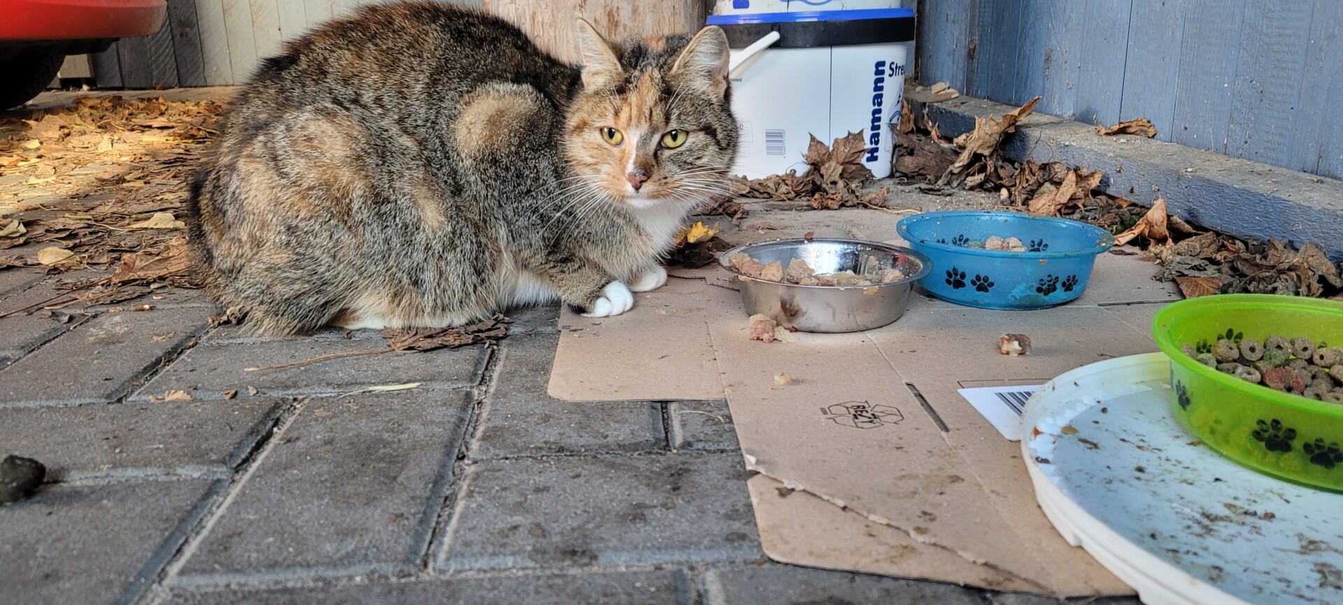 Es handelt sich um eine recht junge Katze (weiblich). Das Tier ist nicht gechipt und wahrscheinlich noch nicht kastriert. Sie weist eine frische Verletzung/Wunde am Schwanz auf. Der Schwanz ist wahrscheinlich durch einen Unfall abgerissen worden.