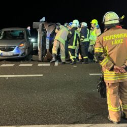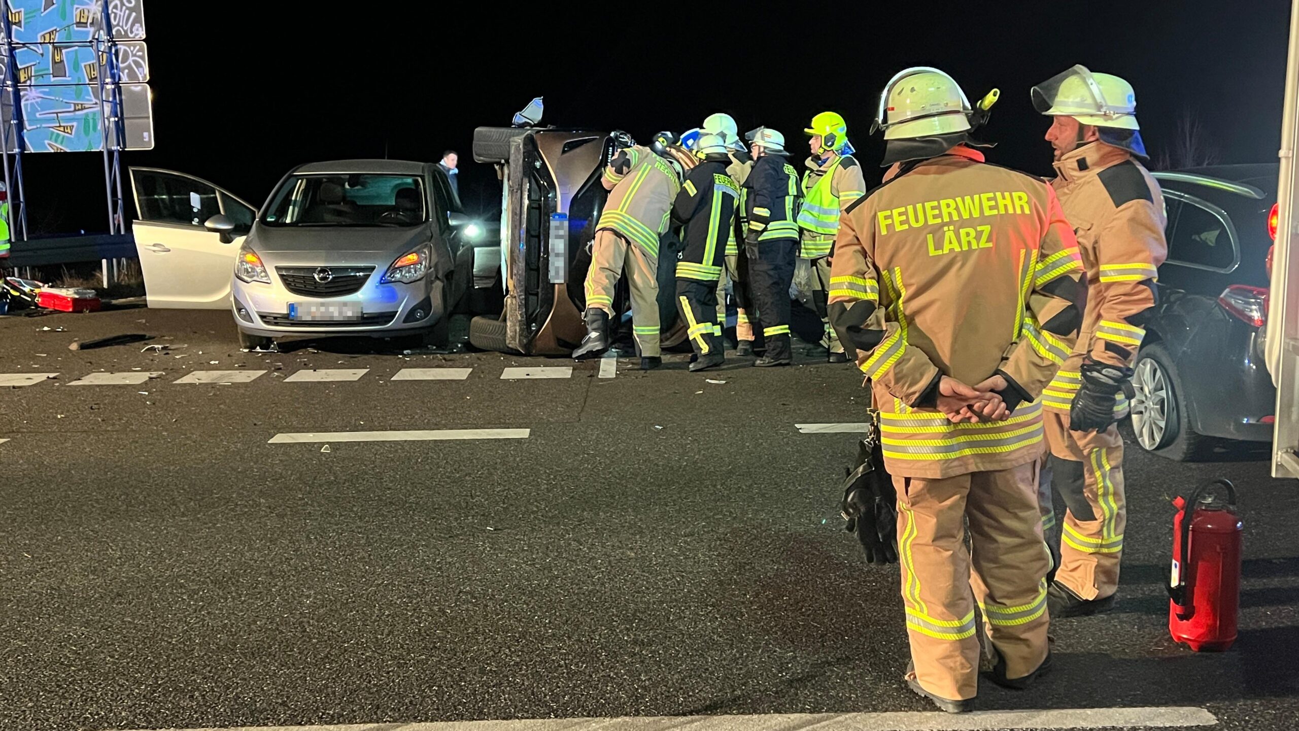 Bei einem Unfall gestern Abend auf der B 198 an der Kreuzung nach Lärz und Boek sind zwei Menschen leicht verletzt worden, den Gesamtschaden gibt die Polizei mit rund 70 000 Euro an. Eine aus Richtung Lärz kommende 64-jährige Fahrerin eines Pkw Nissan missachtete nach Polizeiangaben die Vorfahrt eines aus Richtung Neustrelitz kommenden 38-jährigen Fahrers eines Pkw Peugeot. Durch den Zusammenstoß der beiden Fahrzeuge im Kreuzungsbereich wurde ein Opel eines 78-jährigen Fahrers beschädigt, der an der Kreuzung aus Boek kommend, wartete. Die Fahrzeugführer des Nissan und des Peugeot wurden durch den Unfall leicht verletzt und zur weiteren Versorgung in die Kliniken nach Plau am See und Neustrelitz gebracht. Die beteiligten Pkw waren nicht mehr fahrbereit und mussten abgeschleppt werden. Die Feuerwehren aus Rechlin und Lärz waren mit insgesamt 24 Einsatzkräften, vier Einsatzfahrzeugen und der Amtswehrführung am Einsatzort. Diese mussten die 64-jährige Nissan Fahrerin aus ihrem Fahrzeug holen, da der Wagen auf der Seite lag und die Frau ihn nicht alleine verlassen konnte.