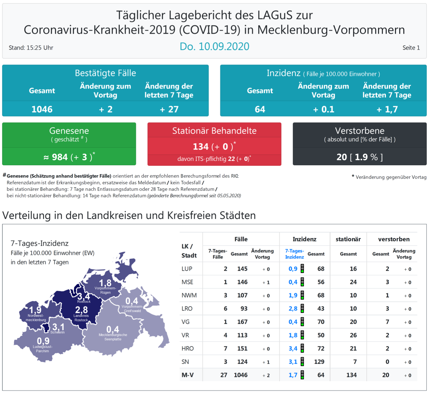 Landesweit müssen oder mussten den Angaben zufolge 134 Menschen in Kliniken behandelt werden, 22 (+0) von ihnen auf Intensivstationen.