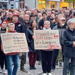 Doreen Peter, die es gewohnt ist, Reden zu halten – allerdings im Berufsleben eher Trauerreden – fing bei ihren Ausführungen in der DDR-Zeit an, zog den Bogen über die Corona-Politik und kam schließlich zur aktuellen Situation. Sie forderte schnelle Neuwahlen, denn: „diese Regierung muss weg, sie gehört in die Mülltonne. Wenn man die Ampelfarben mischt kommt nur braun heraus“, schrie sie in Mikro und erntete anhaltenden Applaus.