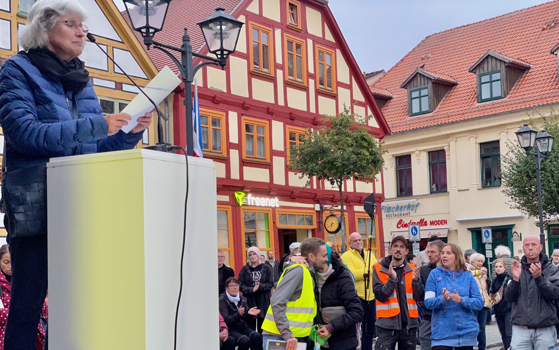 Die große Bühne, oder besser die Ladefläche eines Lkw gehörte gestern auf der Montagsdemo in Waren zwei Frauen: Regina Cleemann aus Waren und Doreen Peter, Bestatterin aus Friedland, sprachen zu den rund 800 Demonstranten auf dem Neuen Markt. Jede auf ihre Art, aber beide zu den Themen, die derzeit in ganz Deutschland für Diskussionen sorgen. Es ging um Waffenlieferungen, um Energiepreise, um Existenzsorgen, um Nord Stream 2 und ein bisschen auch um Corona. Während Regina Cleemann – sie heizte Warens Bürgermeister schon vor der letzten Bürgermeister-Wahl ordentlich ein – eher ruhig und vor allem sehr ausführlich sprach, war die Rede von Doreen Peter überaus emotionsgeladen, laut und teilweise auch populistisch. Doch das kam an bei den Demonstranten. Die Jubelstürme gehörten ihr.
