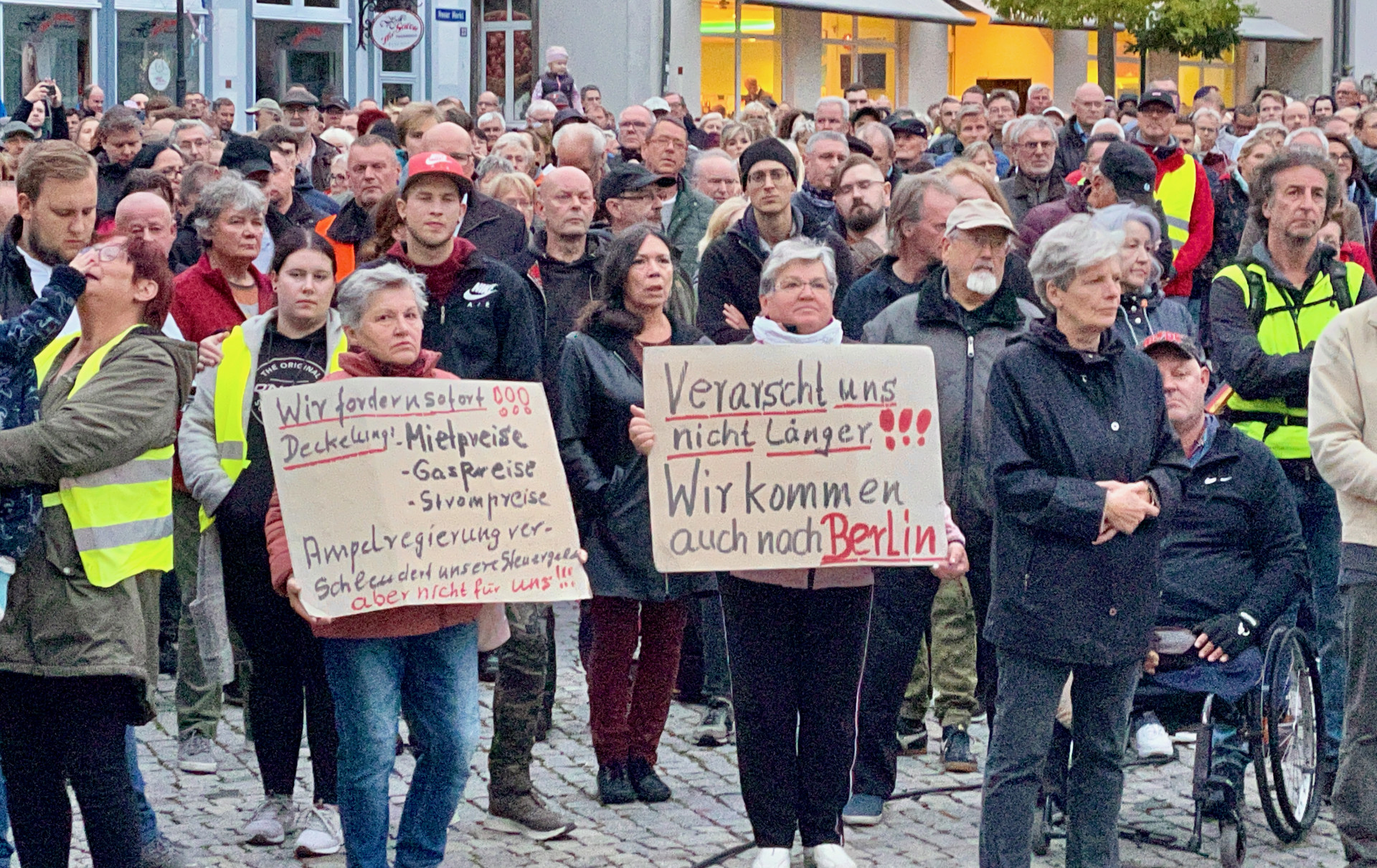 Vergisst die Regierung das eigene Volk, kann es Überraschungen geben. Die Energiepreise sind doch nur die Spitze eines Eisbergs. Sie haben nichts getan für das Gesundheitswesen, besch… Pflegepolitik, besch… Rentenpolitik, besch… Frauenpolitik, keine Reichensteuer, Übergewinnsteuer, nichts für bezahlbare Mieten getan, das KANN nicht ewig so weitergehen! Wenn es den Leuten im Westen anfängt, in die Bude zu regnen, dann sind wir hier im Osten schon fast abgesoffen. Viele werden im Alter arm sein. Nach der ganzen Arbeit!