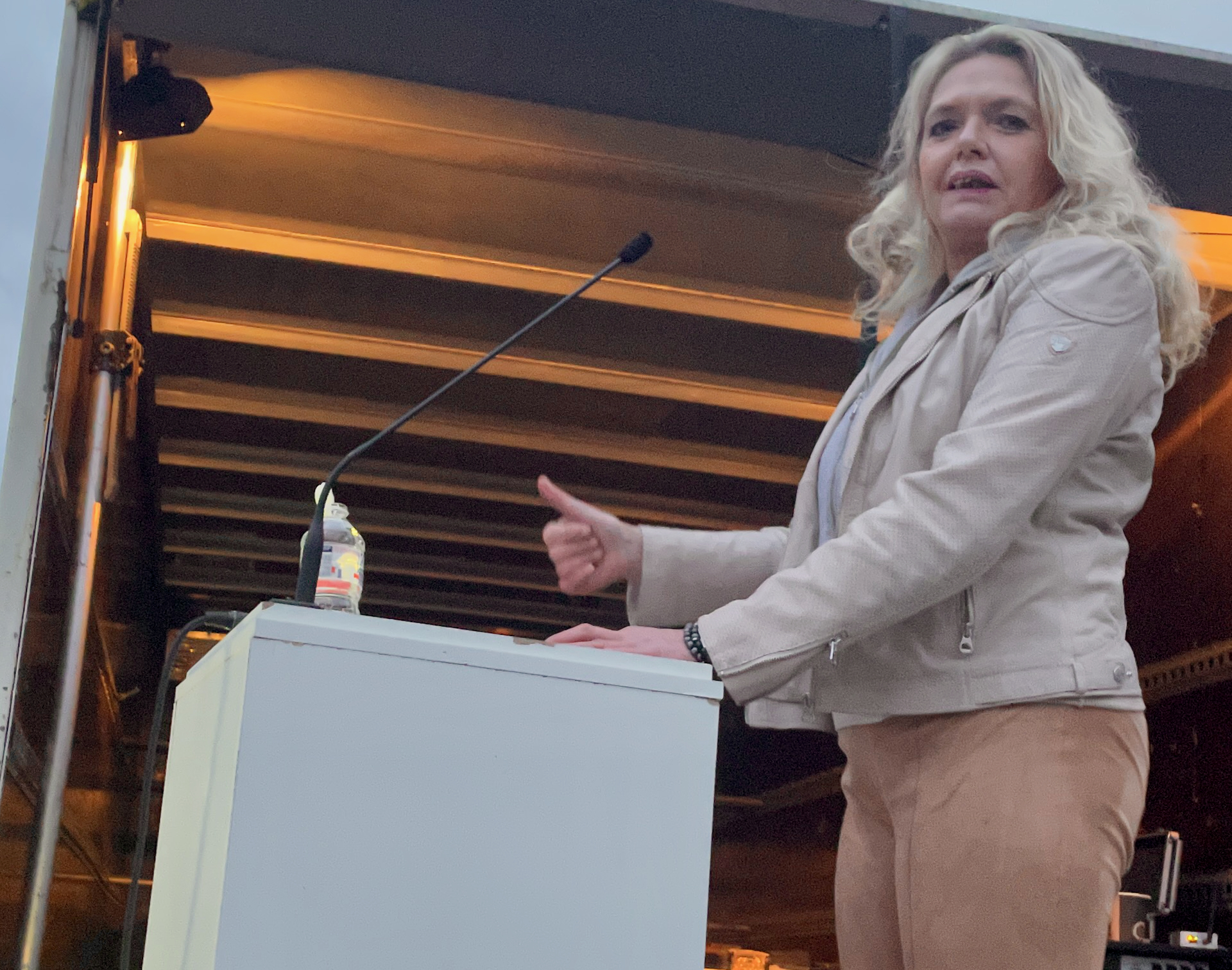 Doreen Peter, die es gewohnt ist, Reden zu halten – allerdings im Berufsleben eher Trauerreden – fing bei ihren Ausführungen in der DDR-Zeit an, zog den Bogen über die Corona-Politik und kam schließlich zur aktuellen Situation. Sie forderte schnelle Neuwahlen, denn: „diese Regierung muss weg, sie gehört in die Mülltonne. Wenn man die Ampelfarben mischt kommt nur braun heraus“, schrie sie in Mikro und erntete anhaltenden Applaus.