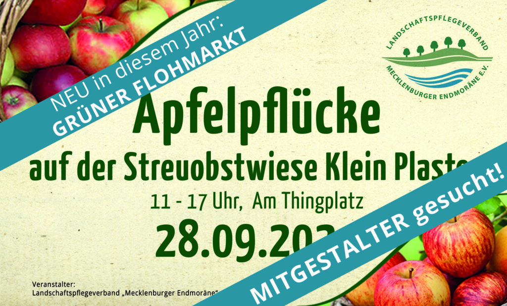 WeiterlesenAuch in diesem Jahr lädt der Landschaftspflegeverband „Mecklenburger Endmoräne“ am 28. September von 11-17 Uhr wieder zur „Apfelpflücke“ auf die Streuobstwiesen nach Klein Plasten ein und sucht noch Mitgestalter. „Wir