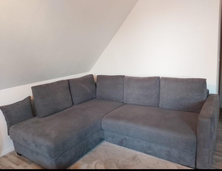 Biete Eckcouch 235/90/184, Ottomane links, Liegefläche 126/202, mit Bettkasten und Topper, 5 Kissen+ 1 Zierkissen, Preis VB