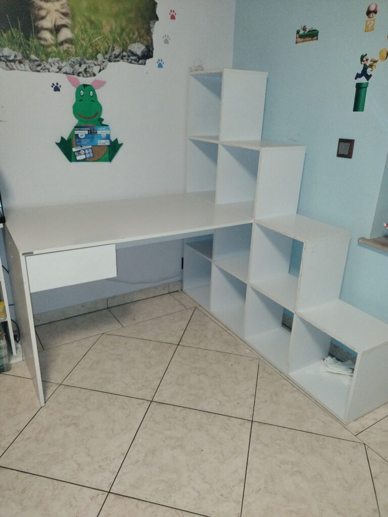 WeiterlesenSchreibtisch mit einer Schublade Regal ist am Schreibtisch befestigt Maße: Tisch: Länge: 110 cm Tiefe: 70cm Höhe: 72 cm Regal: Länge: 140 cm Breite: 30 cm Höhe: 140 cm