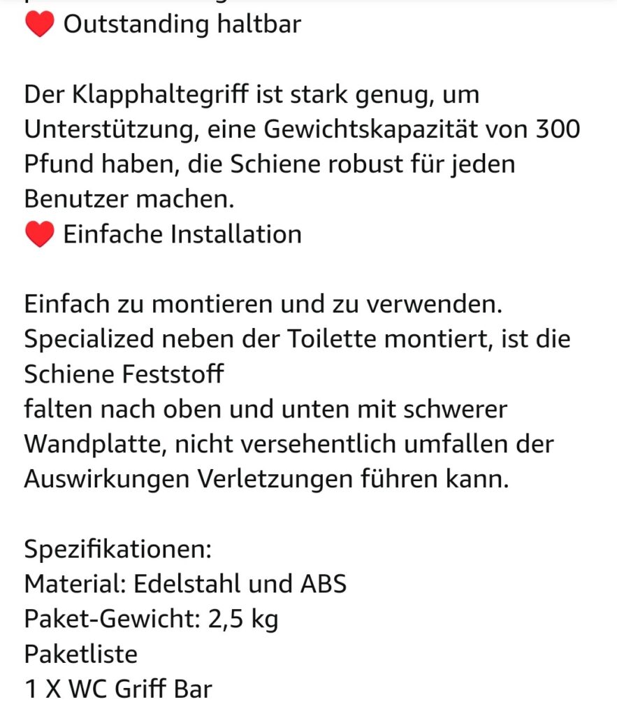 WeiterlesenDieses Sicherheitshandlauf ist für ältere Menschen und Behinderte entworfen worden. Faltbare Armlehne: Wenn sie nicht in Gebrauch ist, spart es Platz. Hohe Qualität: Das Innenmaterial ist für eine langfristige Verwendung