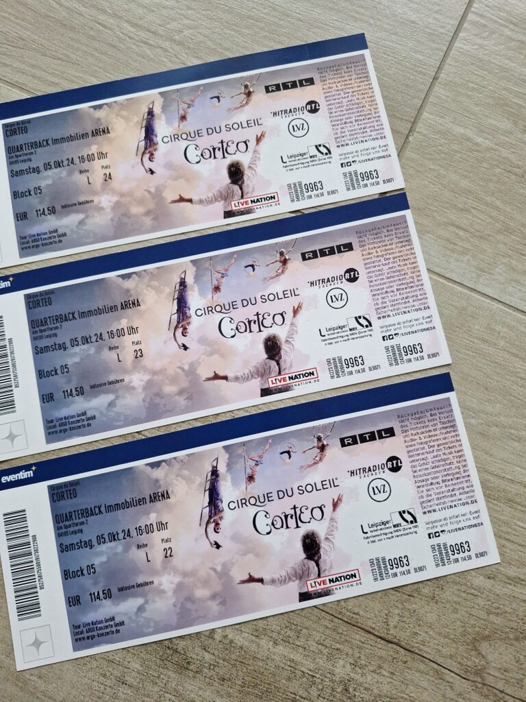 WeiterlesenZum Verkauf stehen bis zu 3 Tickets für Cirque Du Soleil Corteo am 5.10.2024 in Leipzig um 16.00 Uhr in der Quarterback Arena. Die Karten haben original 114,50 Euro pro
