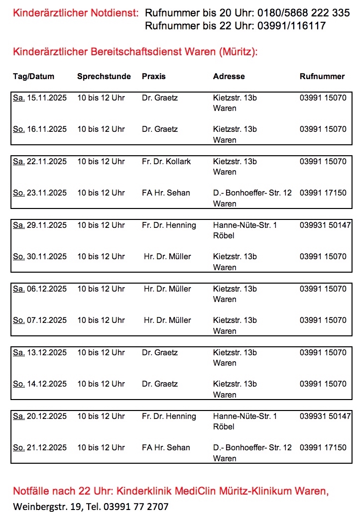 Kassenärztlicher Notdienst Waren: Einheitliche bundesweite Rufnummer: 116 117 (hier erfährt man, wer Bereitschaft hat)