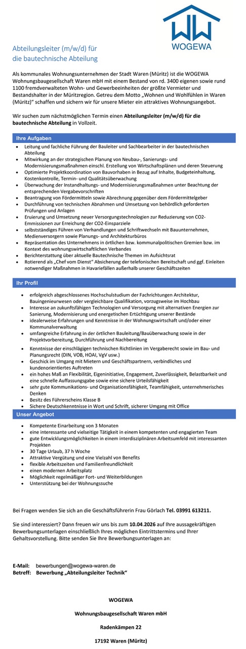 Abteilungsleiter (m/w/d) für die bautechnische Abteilung