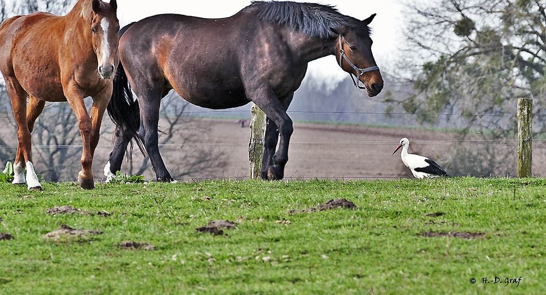 Was sich das Pferd und der Storch wohl gerade zu sagen haben.
