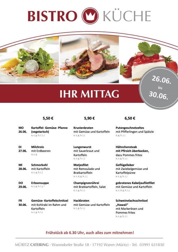 Kartoffel-Gemüse-Pfanne, Krustenbraten sowie Putengeschnetzeltes mit Pfifferlingen sind heute im Angebot in der Bistro-Küche von Müritz Catering im Warener ÜAZ.